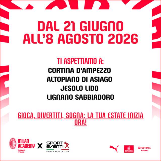 Le iscrizioni all’AC Milan Academy Camp 2026 sono ufficialmente aperte sul nostro sito www.sporteventi.com!
